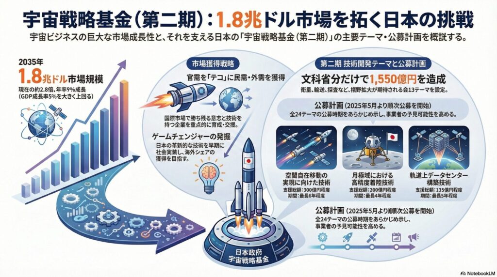 日本政府はJAXAに総額1兆円規模の「宇宙戦略基金」を設置し、民間企業の技術開発や商業化を強力に後押ししています。2026年には第2期の採択事業が本格稼働し、多くのスタートアップが社会実装のフェーズに入ります。