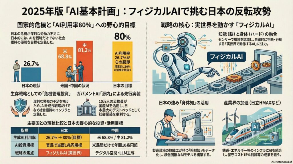 日本政府は2025年末、初の「AI基本計画」を策定し、官民合わせて5年間で1兆円規模の支援を打ち出しました。製造業の現場で培った「身体知(熟練の技や暗黙知)」を強みに、フィジカルAIを日本の「反転攻勢」の核心に据え、人手不足が深刻な介護・建設・物流現場での社会実装を「国家機能を維持するための生存戦略(危機管理投資)」として強力に推進しています。