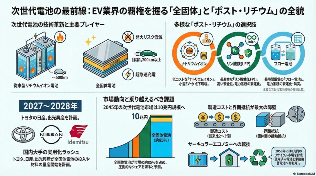 蓄電池の世界市場規模は、2024年現在の約5兆円から、2030年には約40兆円、2050年には約100兆円へと劇的に拡大すると予測されています。その中でも、全固体電池やナトリウムイオン電池を含む次世代電池市場は、2045年に約10.2兆円に達する見通しです。国際エネルギー機関(IEA)は、2030年までにEVが新車販売の45%を占めると予測しており、この巨大な需要を背景に、従来の液系リチウムイオン電池(LIB)の技術的限界を突破する次世代技術が、エネルギー地政学を一変させようとしています。