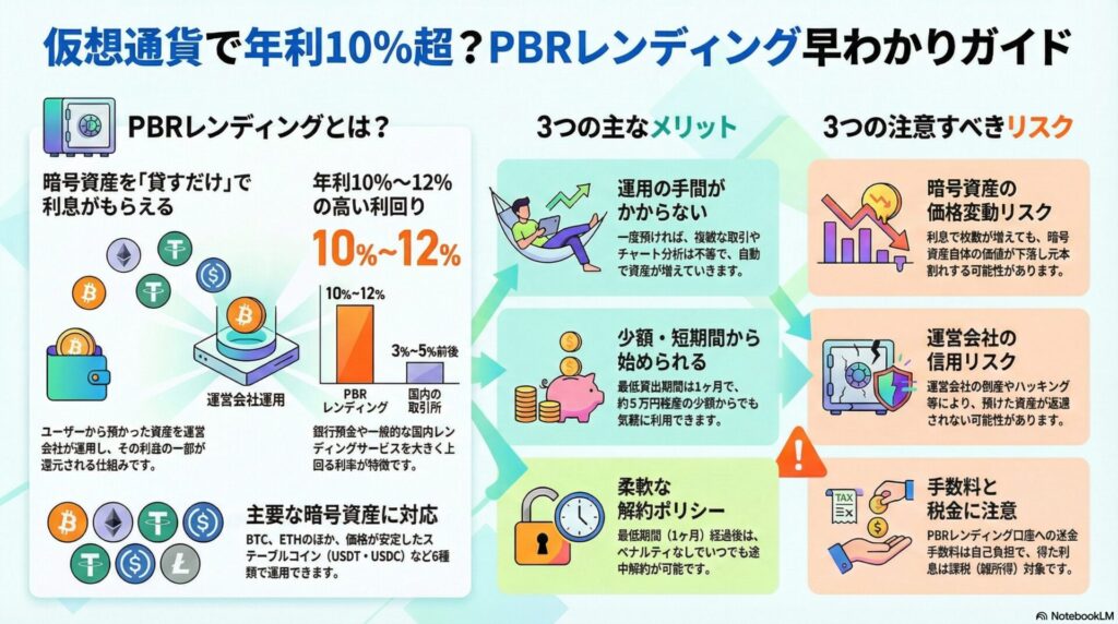 本記事では、PBRレンディングの仕組みや高利回りの秘密、実際の評判、そしてあなたが今日から年利10%超の運用をスタートできる具体的な手順を、ソースに基づき徹底的に解説します。